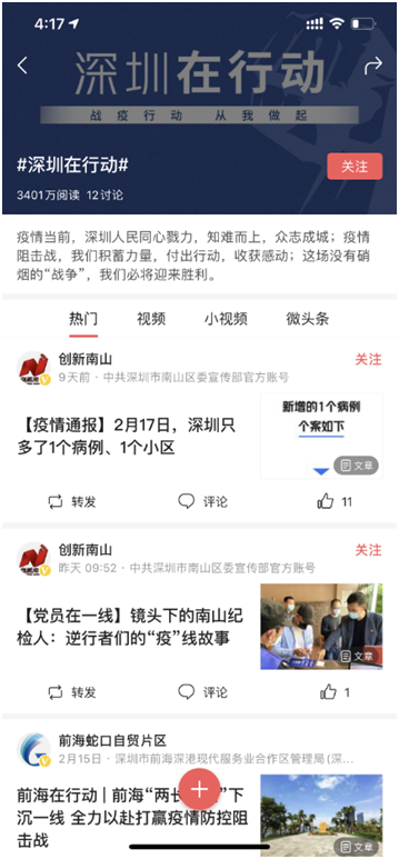 今日頭條話題#全民共抗肺炎深圳在行動#共計3401萬閱讀量,文章參與數130余篇。