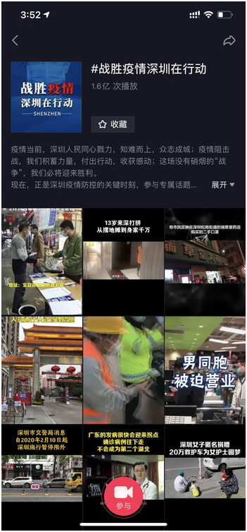 疫情防控期間,深圳市的政務頭條號和政務抖音號也“大放異彩”。以今日頭條和抖音兩個熱門平臺來看,抖音話題#戰(zhàn)勝疫情深圳在行動#截至2月26日已累計1.6億次播放,參與視頻數262個。
