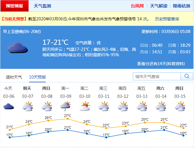 見圳客戶端·深圳新聞網(wǎng)2020年3月6日訊 深圳市氣象局預(yù)計6日陰天間多云,沿海、海區(qū)和高地陣風(fēng)6-7級,16-21℃;7-9日可見陽光,早晚有輕霧;9日夜間至10日冷空氣影響,有雷陣雨,沿海、海區(qū)和高地陣風(fēng)7-8級,天氣再次轉(zhuǎn)涼;11-12日多云間陰天。