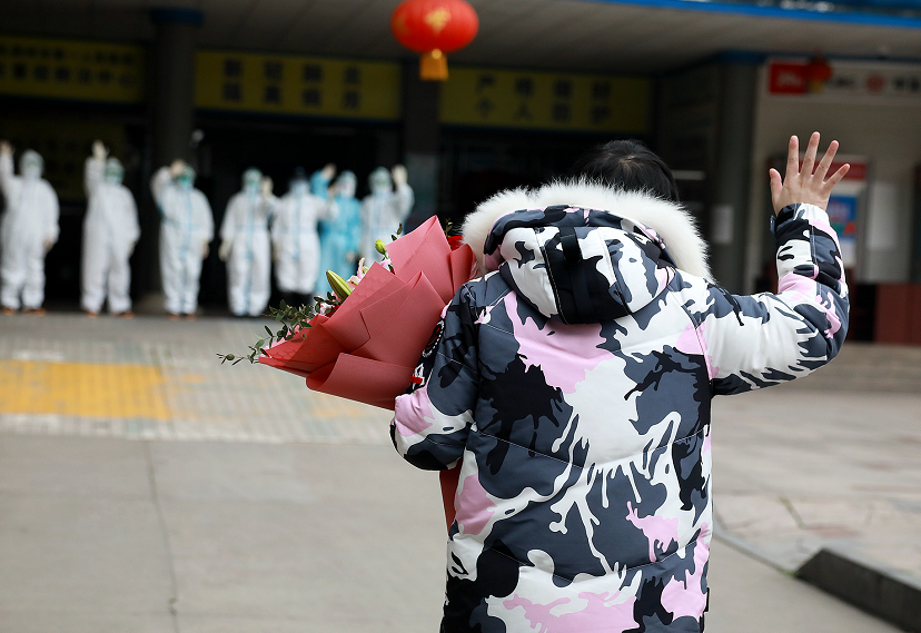 不一會兒,7名穿著防護(hù)服的醫(yī)護(hù)人員將張冬雪護(hù)送了出來。剛一露面,人群中立刻響起一陣掌聲。2位早已在大門外等候的護(hù)士激動地上前與張冬雪擁抱,段昌奉也沖上去把飽含大家祝福和關(guān)心的鮮花獻(xiàn)給她。張冬雪笑著向人群揮手,走了幾步后,又回頭向依然站在門口目送她的7名醫(yī)護(hù)人員深深鞠了一躬,“謝謝,謝謝你們。”