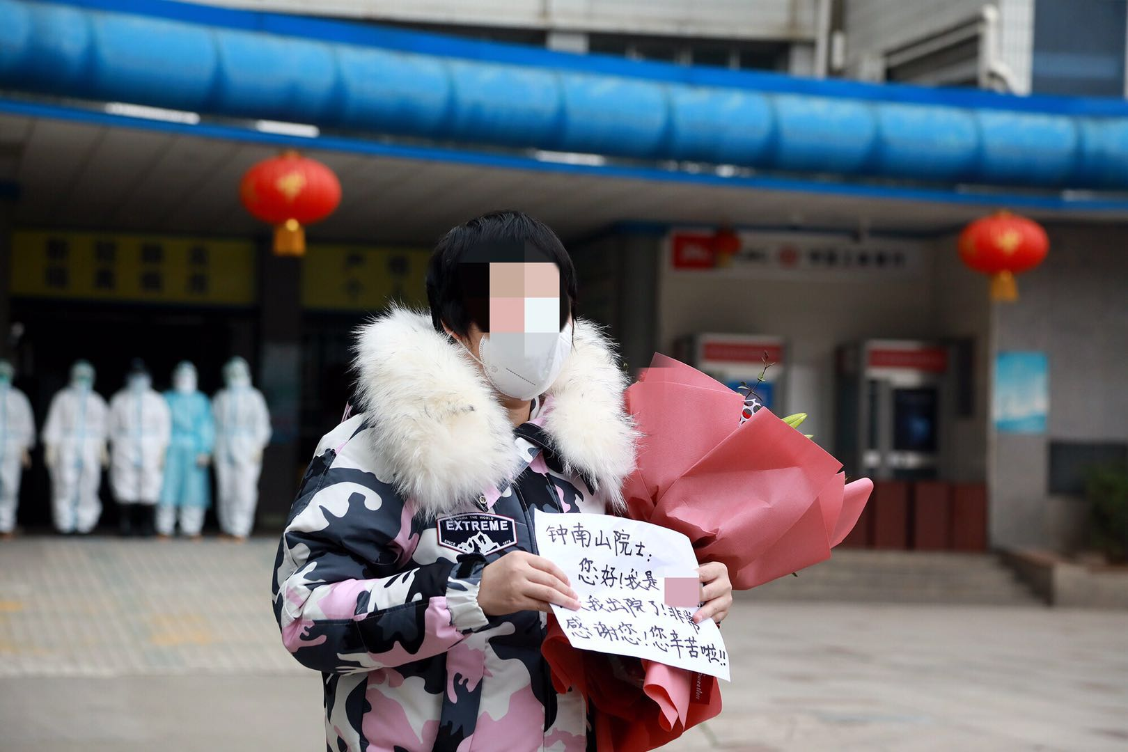 張冬雪走近后,面對記者的鏡頭,打開自己事先準(zhǔn)備好的一張紙,上面寫著“鐘南山院士,您好,今天我出院了,非常感謝您,您辛苦啦!”