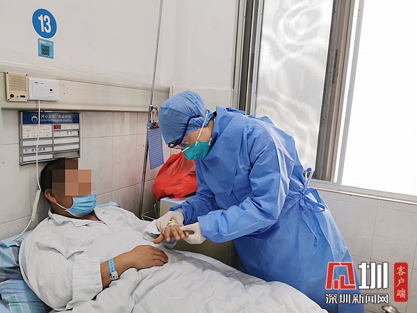 剛剛看到檢測(cè)結(jié)果,鄺醫(yī)生便迅速穿上防護(hù)服,進(jìn)入隔離區(qū)跟患者進(jìn)行了面對(duì)面的溝通交流。那位患者得知自己檢測(cè)的結(jié)果后略顯失落,嘆了一口氣,似乎是擔(dān)心焦慮等待了多日,心里的石頭終于落了地。他說(shuō):“我一定聽(tīng)您的話,好好吃藥,好好治療,爭(zhēng)取活著回來(lái)。”