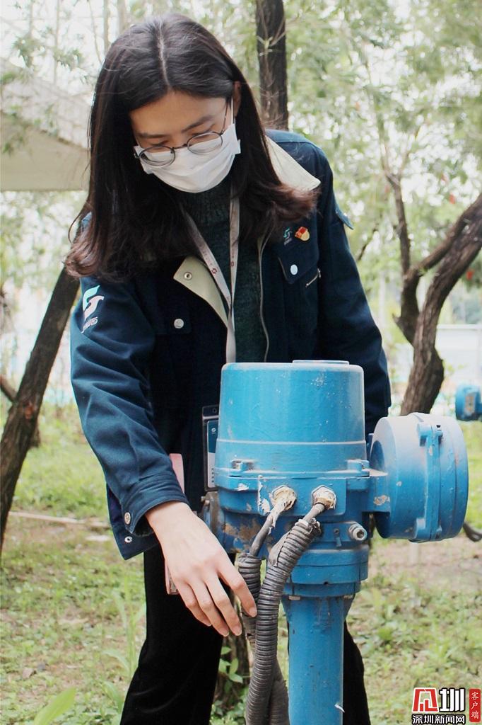 龍華水務(wù)公司紅木山水廠秦雯,正檢查濃縮池出水電動蝶閥運作情況。