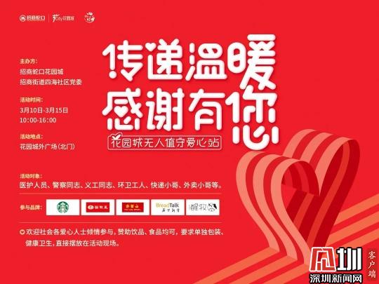 見圳客戶端·深圳新聞網(wǎng)訊(記者 王志明)他們奔波勞累,保障我們生活的秩序與安全他們勇敢逆行盡力守護城市的正常運轉(zhuǎn):醫(yī)護人員、警察同志、社區(qū)工作人員、義工同志、環(huán)衛(wèi)工人、快遞小哥、外賣小哥……今天的招商街道,多了一道靚麗的風景線。 為了向這群最可愛的人表達我們的感恩、感動,招商街道四海社區(qū)黨委攜手招商蛇口花園城,共同開啟“無人值守愛心站”公益活動,每天提供上千份愛心食品免費領取,感謝在這座城市里那些不斷奔波守護著大家生活的平凡英雄們。 活動時間:3月10日至3月15日 活動地點:花園城外廣場 活動對象:醫(yī)護人員、警察同志、社區(qū)工作人員、 義工同志、環(huán)衛(wèi)工人、快遞小哥、外賣小哥等 除了星巴克、面包新語、面點王、許留山、醒牧等商家熱心公益傾情參與此次公益活動,花園城的許多員工也自發(fā)的采購起來,抱著一份份愛與尊敬時刻補貨,用自己微小的力量幫助著逆行者們。 花園城無人值守愛心站活動時間為3月10日至15日,持續(xù)6天,歡迎社會愛心人士傾情參與食品贊助,所提供物品采用單獨包裝、健康衛(wèi)生,直接擺放在活動現(xiàn)場即可。 春暖花開,山河無恙,人間皆安。待疫情結(jié)束,我們定會溫暖相遇在這座鮮花簇擁的城市里。
