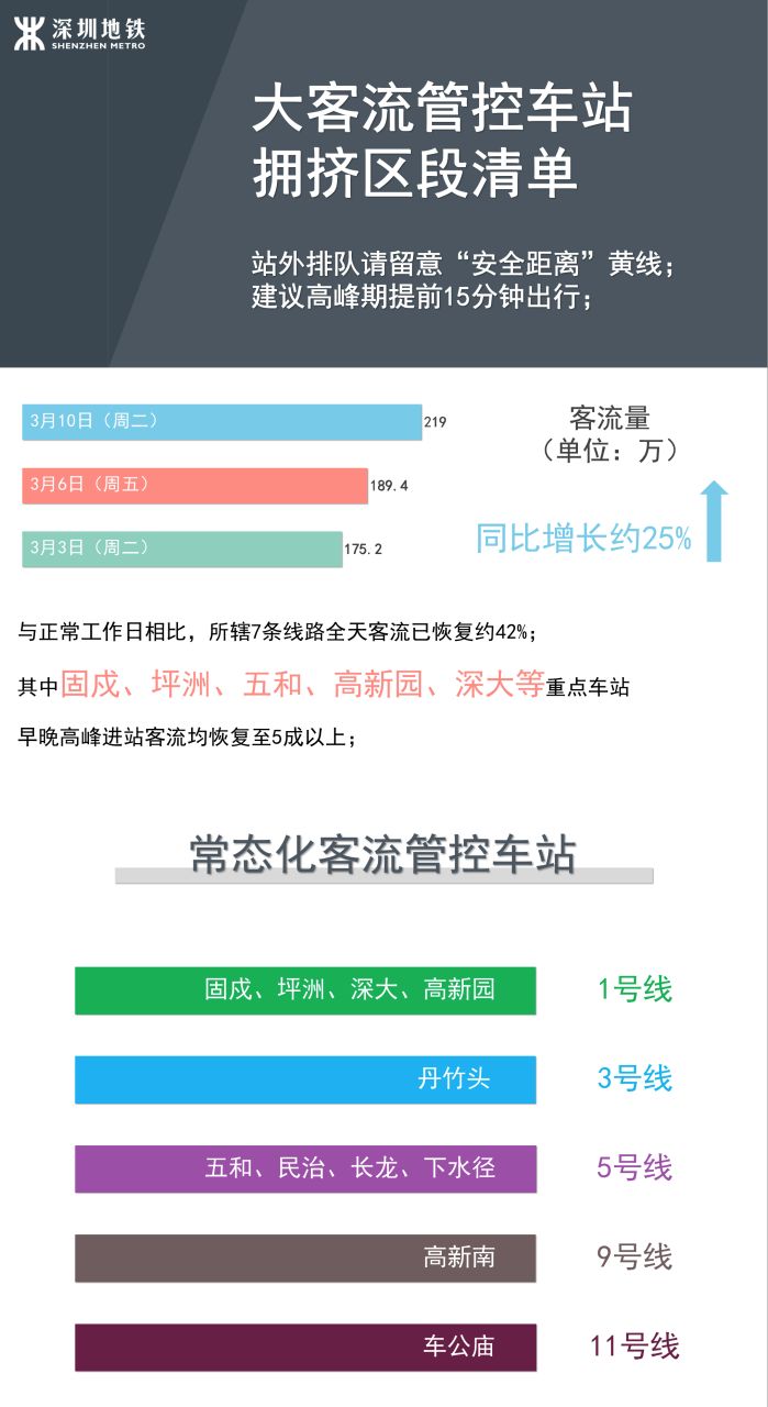 截至3月10日(周二),深圳地鐵所轄7條線(xiàn)路已有26座車(chē)站在高峰期出現(xiàn)較大客流。