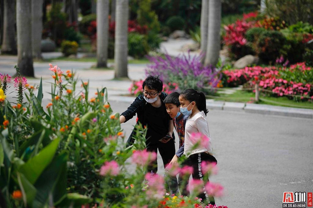 一位家長帶著孩子們觀賞鮮花。