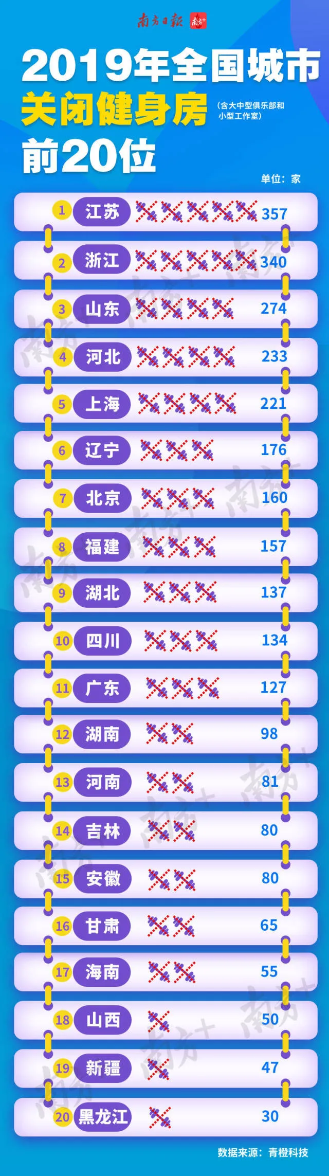 2019年同比增長了3013間健身房。增長數(shù)量位居全國第二,同期僅關(guān)閉127家健身房。