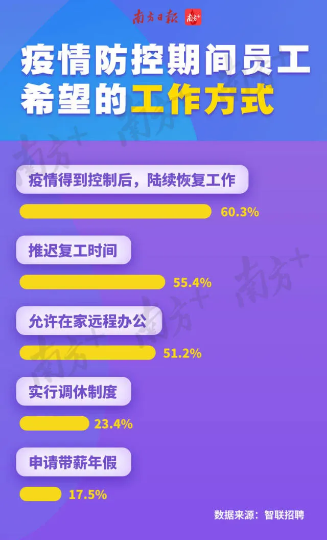 其中,60.3%的職場人希望疫情得到控制后再陸續(xù)復(fù)工,盡管這種理想狀況可能性不大,也有55.4%的職場人希望推遲復(fù)工時(shí)間,51.2%的職場人呼吁遠(yuǎn)程辦公。