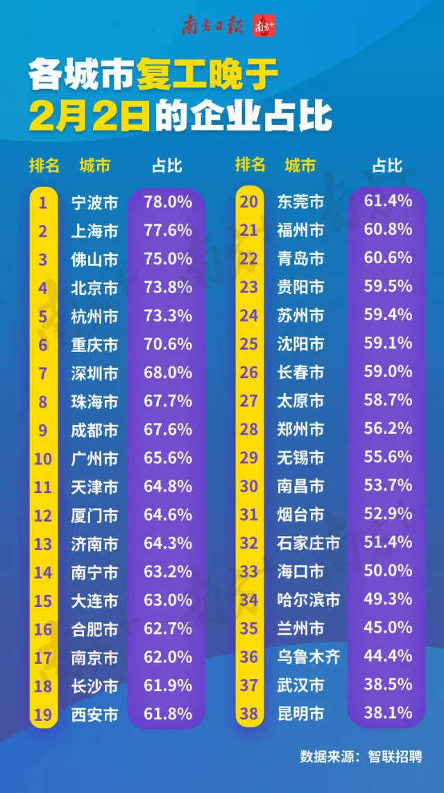 同樣根據(jù)這份《報(bào)告》,全國各城市晚于2月2日復(fù)工的企業(yè)占比統(tǒng)計(jì)排名顯示,前10名中9個(gè)城市均為南方城市,寧波企業(yè)延遲復(fù)工響應(yīng)度最高,確定2月2日后復(fù)工的企業(yè)占比達(dá)到了78%。前10名中4個(gè)為廣東城市,分別是佛山、深圳、珠海、廣州。
