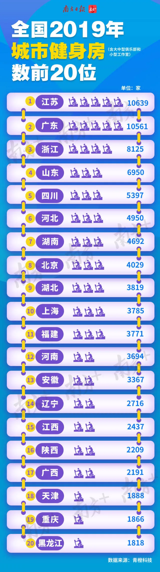 其中江蘇10639家位列第一,廣東10561家排名第二。這個(gè)數(shù)據(jù)充分說明廣東在體育健身領(lǐng)域走在前列。