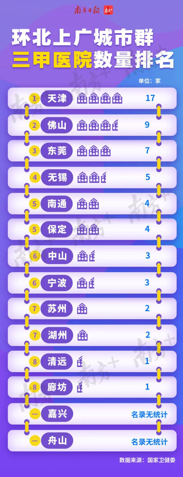 從統(tǒng)計(jì)表中可以看到,天津三甲醫(yī)院數(shù)量一騎絕塵。而廣東的佛山、東莞三甲醫(yī)院數(shù)量也不少,醫(yī)療實(shí)力值得重視。中山名列第六,在國家衛(wèi)健委名錄中甚至高于蘇州。