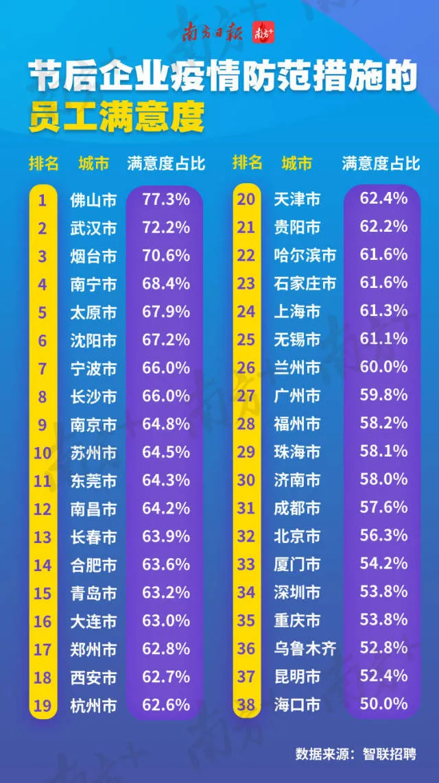 從上述《報(bào)告》中可以看出,佛山市企業(yè)的員工滿意度是全國最高的,高達(dá)77.3%,與全城“停擺”的武漢、山東煙臺(tái)齊齊超過七成滿意度。