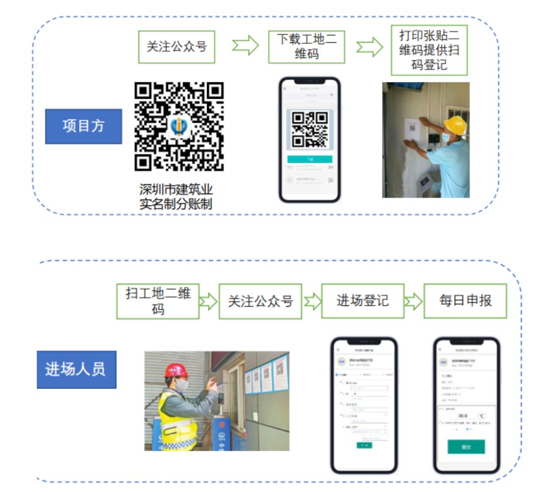 市場建設(shè)單位應(yīng)關(guān)注深圳市建筑業(yè)實(shí)名制分賬制微信公眾號,獲取本工地的微信二維碼,并將工地二維碼張貼至工地公示區(qū)域。施工人員每日進(jìn)場前測溫后,掃碼申報個人測溫結(jié)果和健康狀況。