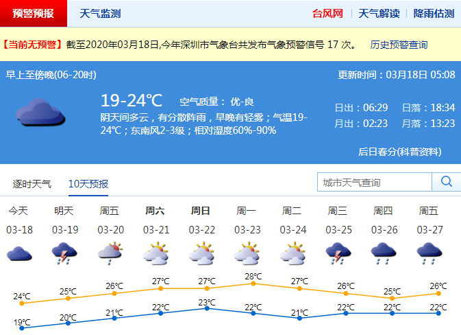 見圳客戶端·深圳新聞網(wǎng)2020年3月18日訊 送走前幾日干爽的天氣,我市將迎來新一波降雨。記者從市氣象局獲悉,受高空小波動和低層西南風加大影響,預計18-19日我市有明顯降雨,其中18日陰天間多云,有分散陣雨,氣溫19-24℃;19日陰天有(雷)陣雨,部分時間雨勢稍大;20日陣雨轉(zhuǎn)多云,早晚有輕霧或霧;21-24日多云為主,天氣溫暖濕潤。