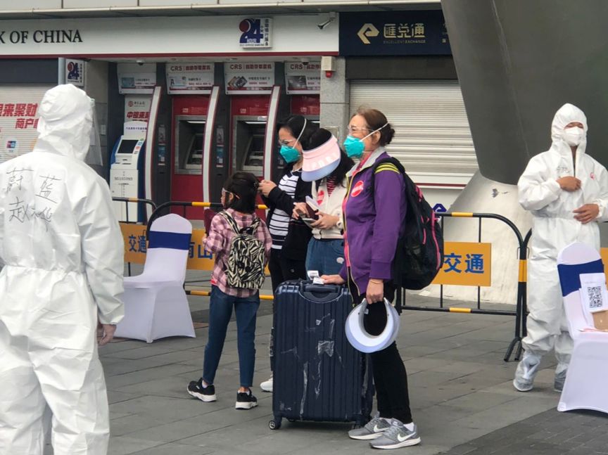 入境人員在工作人員的指引下準備接受分流