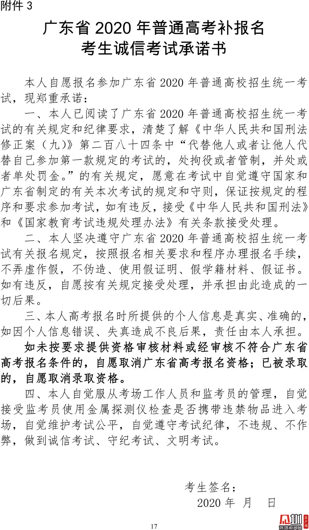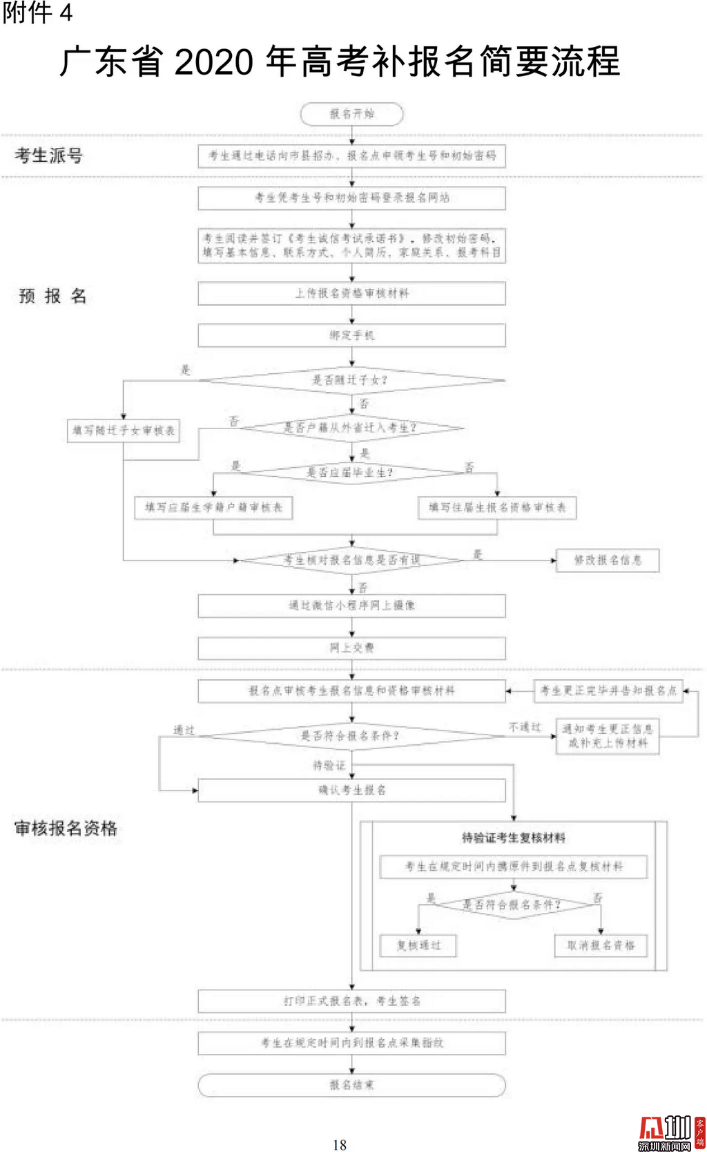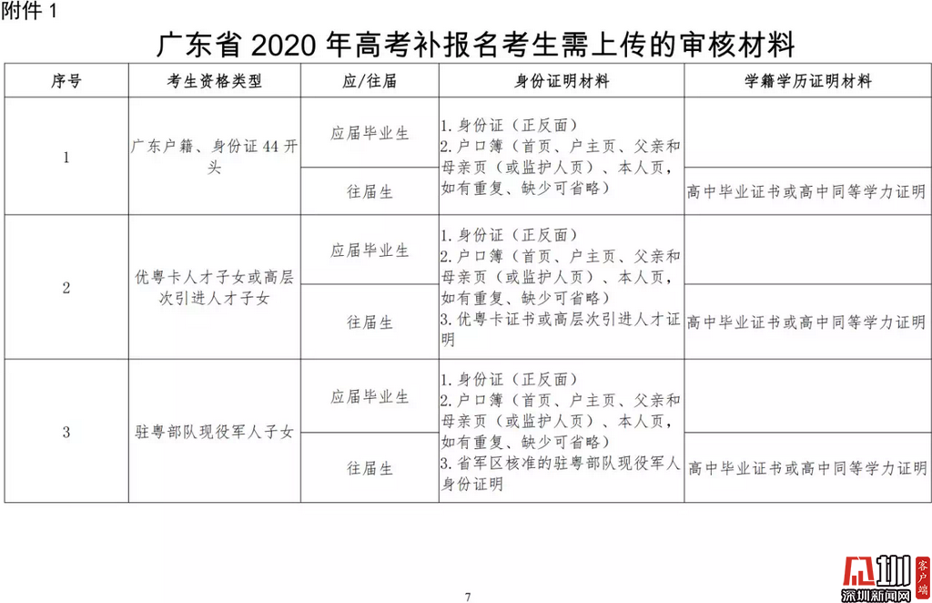 見圳客戶端·深圳新聞網(wǎng)2020年3月19日訊(見圳客戶端、深圳新聞網(wǎng)記者 金洪竹)3月18日,記者從廣東省招生委員會辦公室獲悉,為滿足退伍軍人、運動訓(xùn)練及武術(shù)與民族傳統(tǒng)體育考生、高職院校自主招生考生等符合我省高考條件,因各種原因尚未參加高考報名人員的需求,經(jīng)研究決定安排一次高考補報名,補報名時間為3月23-26日。同時,為確??忌涂荚嚬ぷ魅藛T的生命安全和身體健康,減少聚集,本次高考補報名采取先線上辦理、后補驗材料的方式進行。