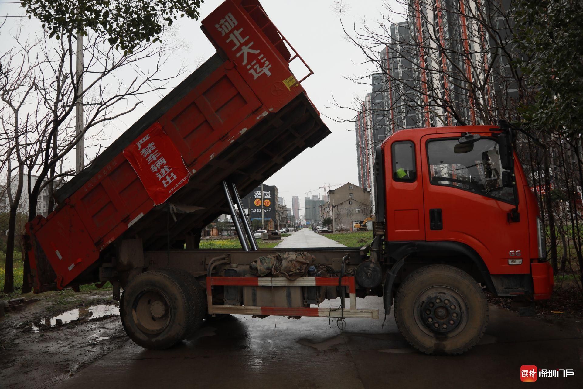 2月26日,監(jiān)利,用于隔斷交通的大貨車(chē)。