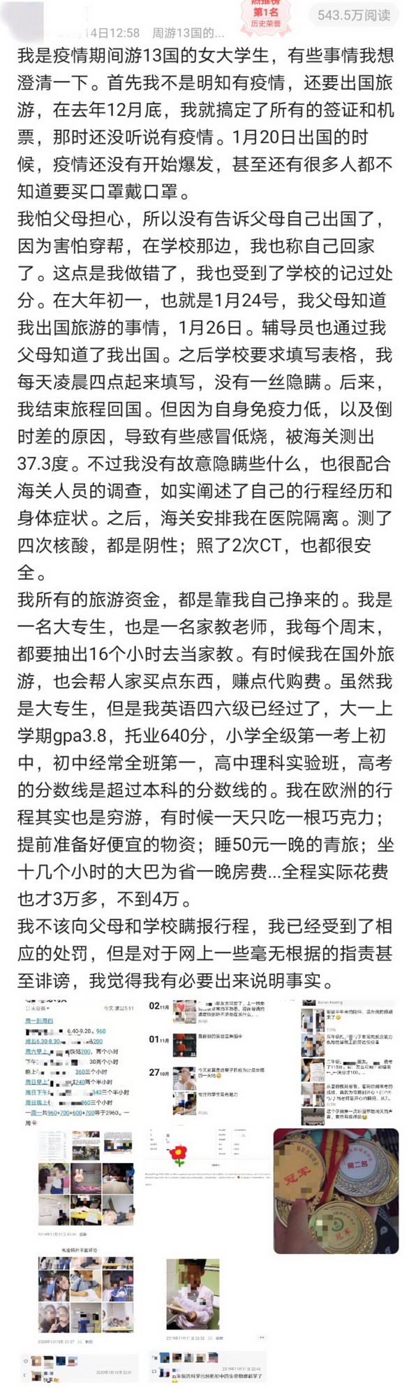 記者從小Y處了解到,1月20日,她出發(fā)開始旅行并于3月3日從珠海入境回國,期間共游玩13個國家?!?0月份就已經決定出去玩,11月一直在準備簽證,12月中旬簽證什么的都已經準備好了?!庇捎诤ε赂改笓乃蝗嗽谕饴眯械陌踩珕栴},出發(fā)時并沒有告知父母。“1月23日,學校要求所有學生填寫一個假期所在地,我填寫的是‘在家’,因為不想讓家里人知道我在國外,害怕穿幫。出發(fā)時國內疫情還沒有爆發(fā),所以不是很清楚國內的疫情,也沒想到填這個信息是為了防控疫情所用,所以沒有如實填寫。大年初一,也就是1月24日,我父母知道了我出國的事,對我嚴厲批評。之后學校要求填寫表格,我沒有隱瞞,都是如實填寫?!?/p>