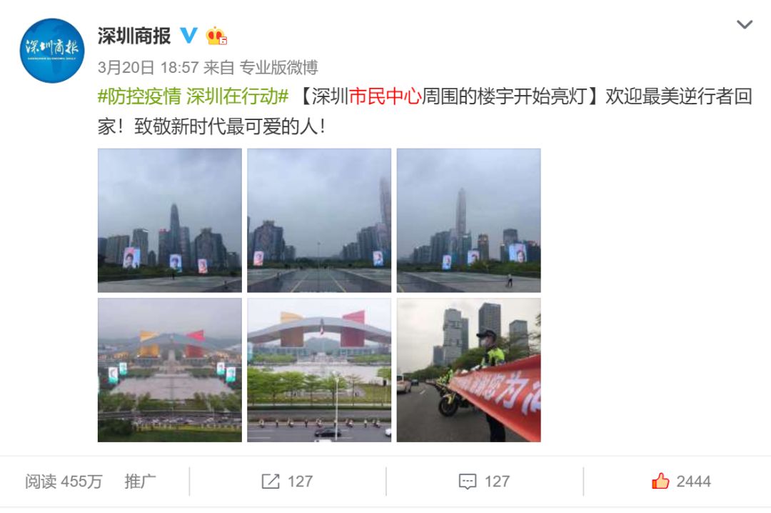 單條微博【深圳市民中心周圍的樓宇開(kāi)始亮燈】閱讀數(shù)455萬(wàn)+,引起了廣泛關(guān)注。