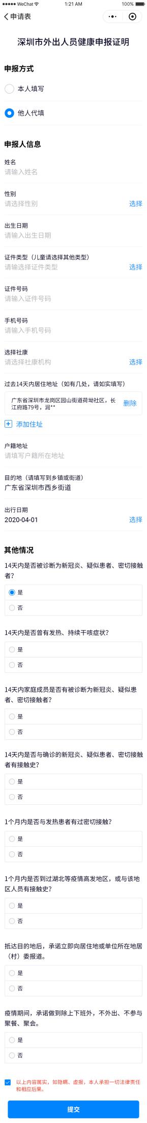 在具體操作上,市民可關注“深圳衛(wèi)健委”官方微信或“社康通”微信小程序,點擊“外出人員健康證明”,按要求填寫相關個人信息,選擇就近的社康中心以及出行目的地和出行時間,并選擇是否14天內(nèi)有過發(fā)熱、干咳,是否與新冠肺炎確診患者接觸等。在填寫完畢后,便可提交。