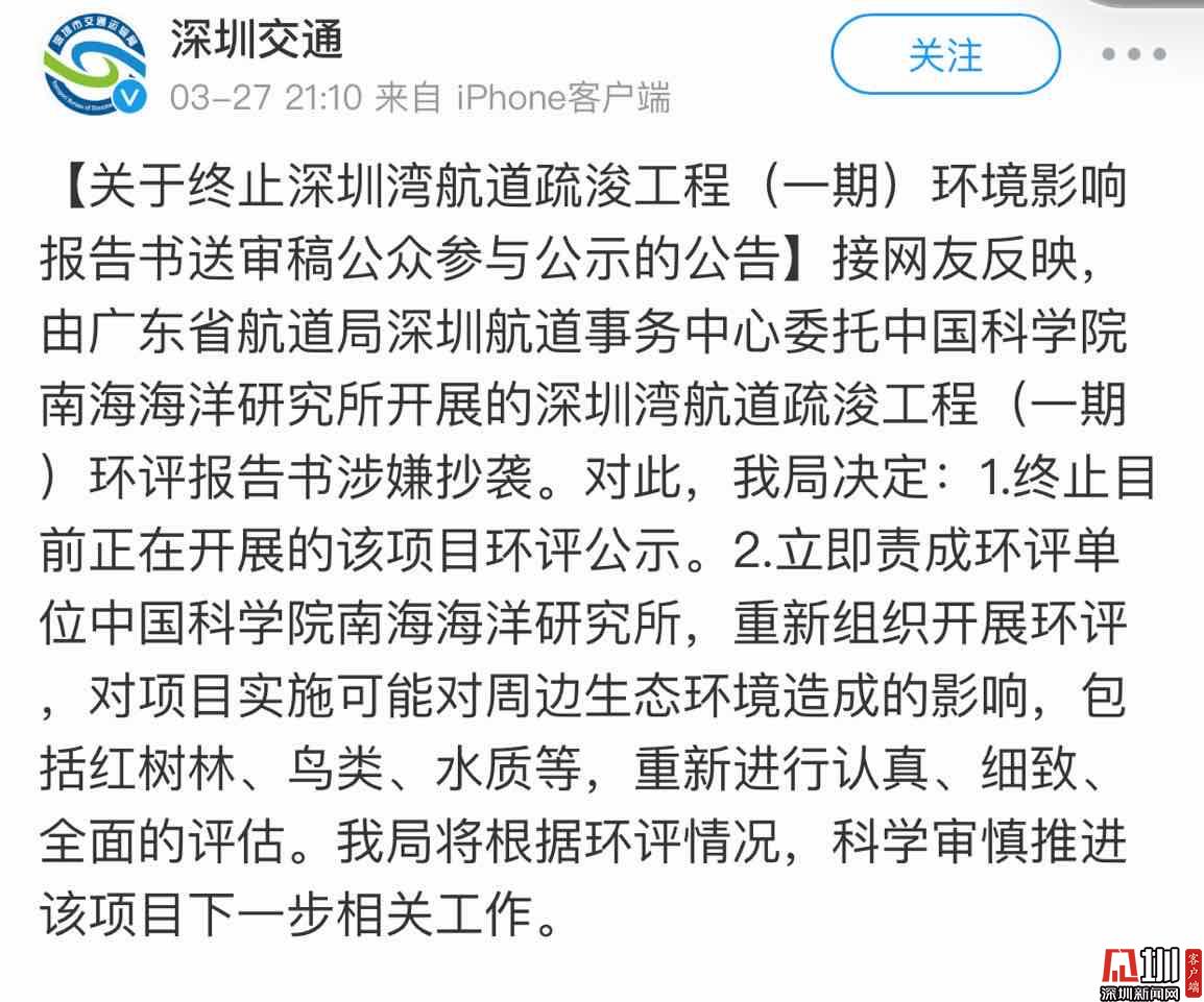 3月27日21時10分,深圳市交通運輸管理局官方微博發(fā)布消息稱:接網(wǎng)友反映,由廣東省航道局深圳航道事務中心委托中國科學院南海海洋研究所開展的深圳灣航道疏浚工程(一期)環(huán)評報告書涉嫌抄襲。對此,深圳市交通運輸管理局決定:1.終止目前正在開展的該項目環(huán)評公示。2.立即責成環(huán)評單位中國科學院南海海洋研究所,重新組織開展環(huán)評,對項目實施可能對周邊生態(tài)環(huán)境造成的影響,包括紅樹林、鳥類、水質(zhì)等,重新進行認真、細致、全面的評估。深圳市交通運輸管理局將根據(jù)環(huán)評情況,科學審慎推進該項目下一步相關工作。