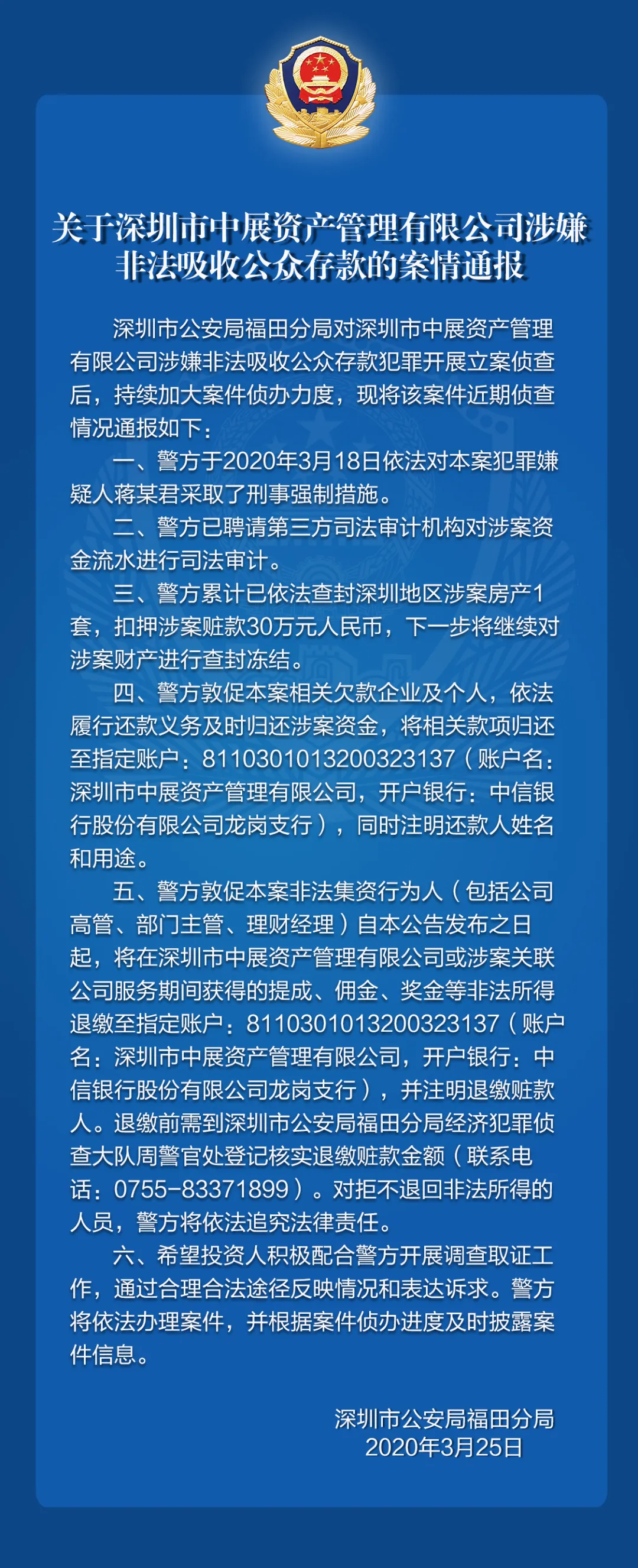 關(guān)于深圳市軒鴻基金管理有限公司、深圳市中展資產(chǎn)管理有限公司涉嫌非法吸收公眾存款的案件情況通報(bào)