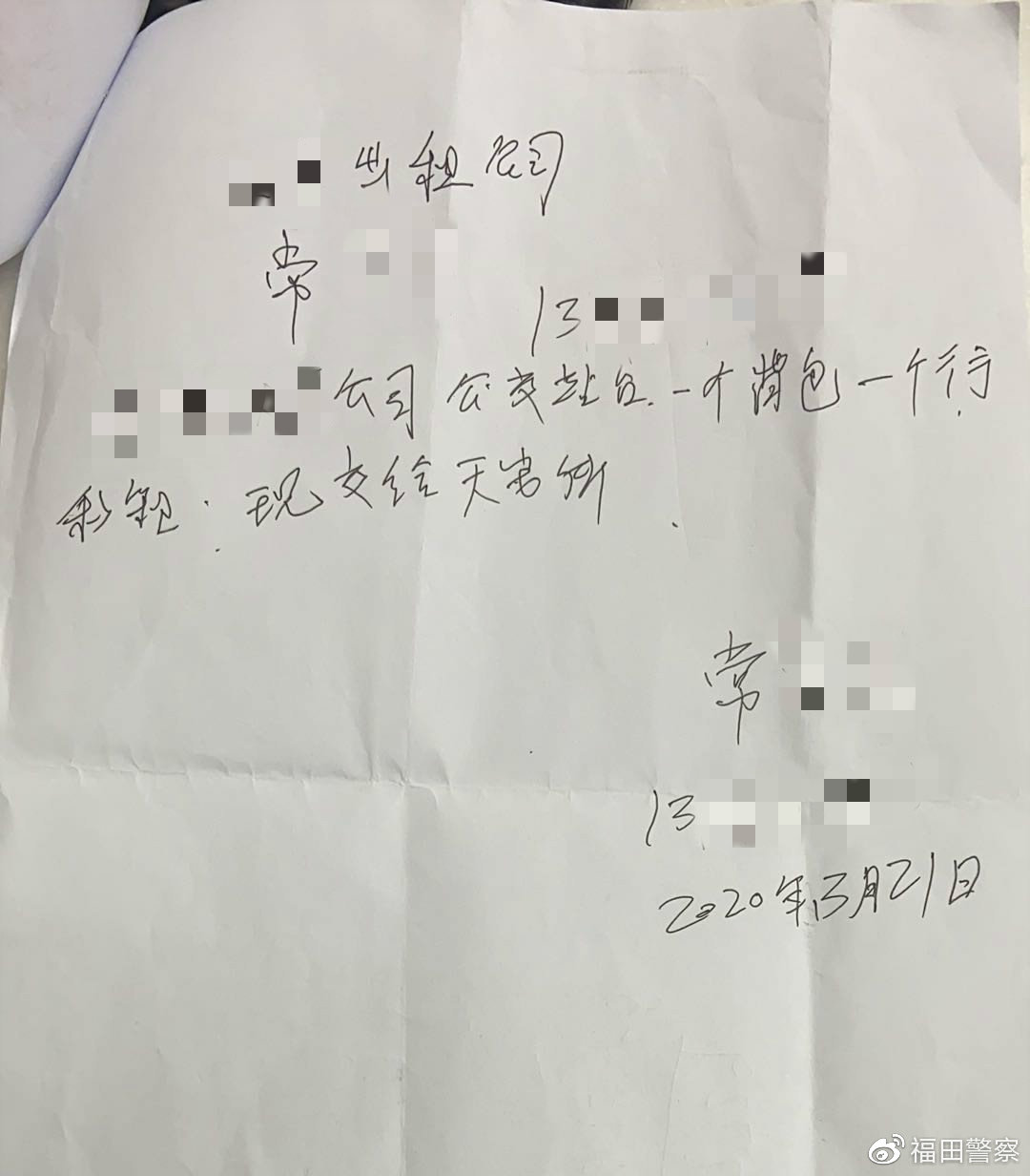 3月21日晚,一輛的士開到深圳市公安局福田分局天安派出所門口,的士司機(jī)從車上拿下來一個黑色的背包和銀色的行李箱到前臺。