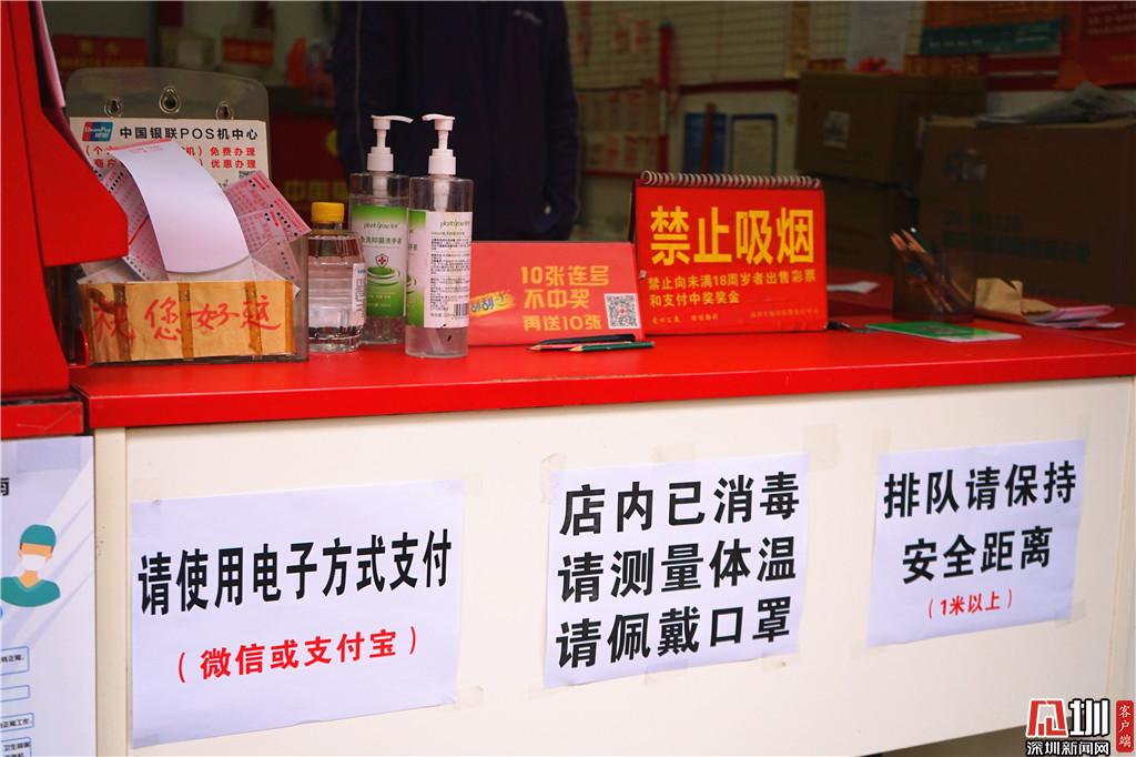 另一家在福田區(qū)華發(fā)北路,店號為83021044的投注站點(diǎn),門口已經(jīng)被店員用桌子堵上,并貼上了相關(guān)防疫告示,“之前深圳福彩中心的工作人員來檢查過,后續(xù)也會(huì)給我們配送一些防護(hù)物資?!庇浾咴诖擞^察了30分鐘,期間僅有兩位彩民前來,共購買了8元彩票。店主馬先生向記者介紹,“以前大家都會(huì)來店里邊坐,主要買的是20分鐘開兩次的‘快樂彩’,現(xiàn)在都不給進(jìn)來,那個(gè)彩票也暫停銷售了。”