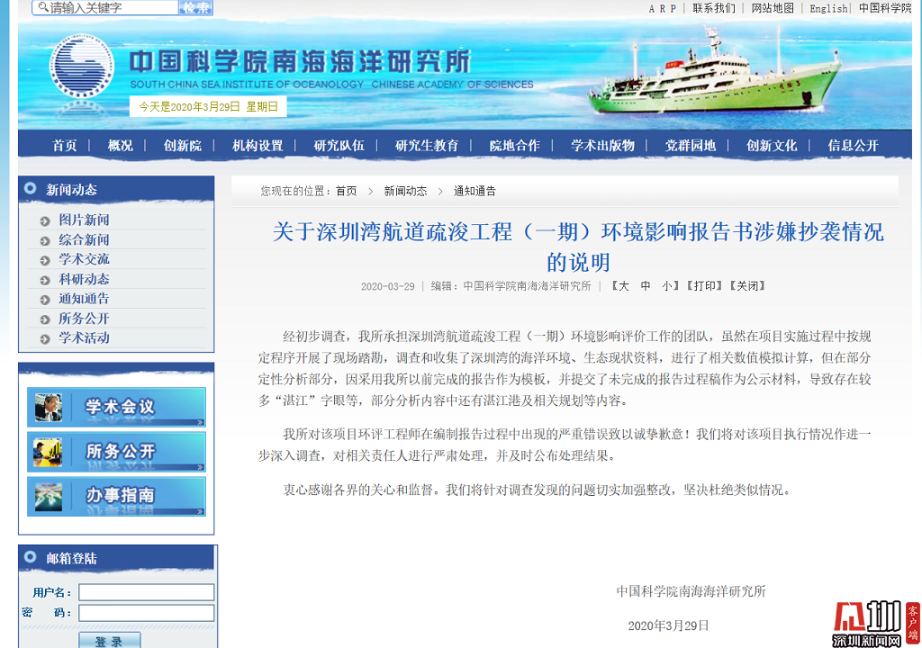 見圳客戶端·深圳新聞網(wǎng)2020年3月29日(見圳客戶端、深圳新聞網(wǎng)記者 鐘鴻冰)3月29日,中國科學院南海海洋研究所在官網(wǎng)發(fā)布說明稱:深圳灣航道疏浚工程(一期)環(huán)境影響評價工作雖按規(guī)定進行了現(xiàn)場踏勘,調(diào)查并收集了有關(guān)資料等環(huán)節(jié),但因采用其以前的報告作為模板,并將未完成的報告作為公示材料,導致公示的環(huán)評報告中出現(xiàn)多處錯誤。南海海洋研究所表示,將對相關(guān)責任人嚴肅處理并公示處理結(jié)果。