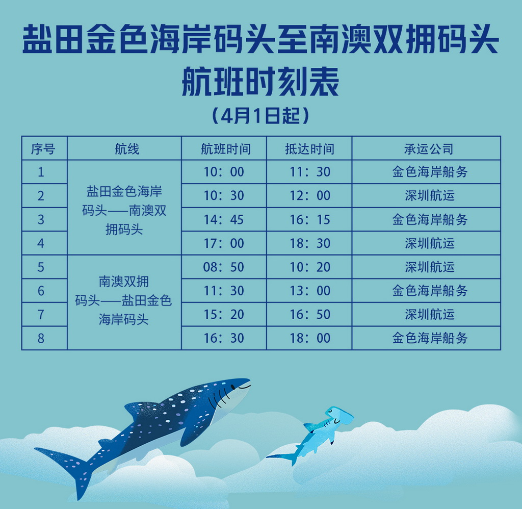 據(jù)了解,“鹽田-南澳”海上交通往返航線自3月12日正式復(fù)航,每天共4班。深圳航運(yùn)集團(tuán)增開后,該航線航班數(shù)量將恢復(fù)至疫情前的水平,達(dá)到每天8班。其中,由鹽田金色海岸碼頭至南澳雙擁碼頭新增航班時(shí)間為:10時(shí)30分和17時(shí);由南澳雙擁碼頭至鹽田金色海岸碼頭新增航班時(shí)間為8時(shí)50分和15時(shí)20分。廣大市民及旅客朋友可通過深圳航運(yùn)旗下公眾號(hào)“鵬星會(huì)”查詢航班信息及訂票,單程成人票60元/人。