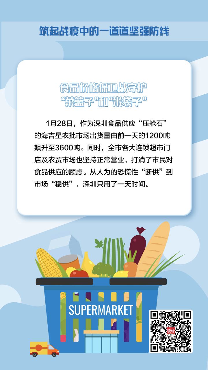 “食品價格保衛(wèi)戰(zhàn)”第一槍在1月27日打響。當天,市菜籃子工程領(lǐng)導小組召集各大商超市場責任人開會,制定詳細的作戰(zhàn)計劃。1月28日,作為深圳食品供應“壓艙石”的海吉星農(nóng)批市場出貨量由前一天的1200噸飆升至3600噸。同時,全市各大連鎖超市門店及農(nóng)貿(mào)市場也堅持正常營業(yè),打消了市民對食品供應的顧慮。從人為的恐慌性“斷供”到市場“穩(wěn)供”,深圳只用了一天時間。