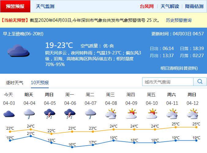 見圳客戶端·深圳新聞網2020年4月3日訊 深圳今日陰天間多云,夜間轉陣雨;氣溫21-23℃;偏東風3級,沿海、高地和海區(qū)陣風6級左右;相對濕度70%-95%。清明假期4-6日有一次明顯降雨過程,并伴有雷暴,氣溫下降,其中4日有(雷)陣雨,5-6日有中到大雨局部暴雨;7日降雨減弱,轉多云。