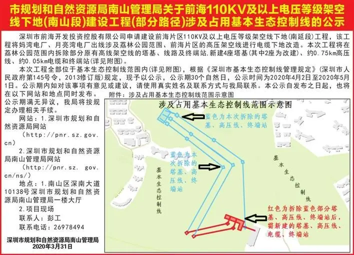 目前這個高壓線下地項目又傳來新進展。近日,消息報記者從市規(guī)劃和自然資源局南山管理局獲悉,前海片區(qū)110千伏及以上電壓等級架空線下地(南延段)工程,即將啟動建設(shè),現(xiàn)正公示。