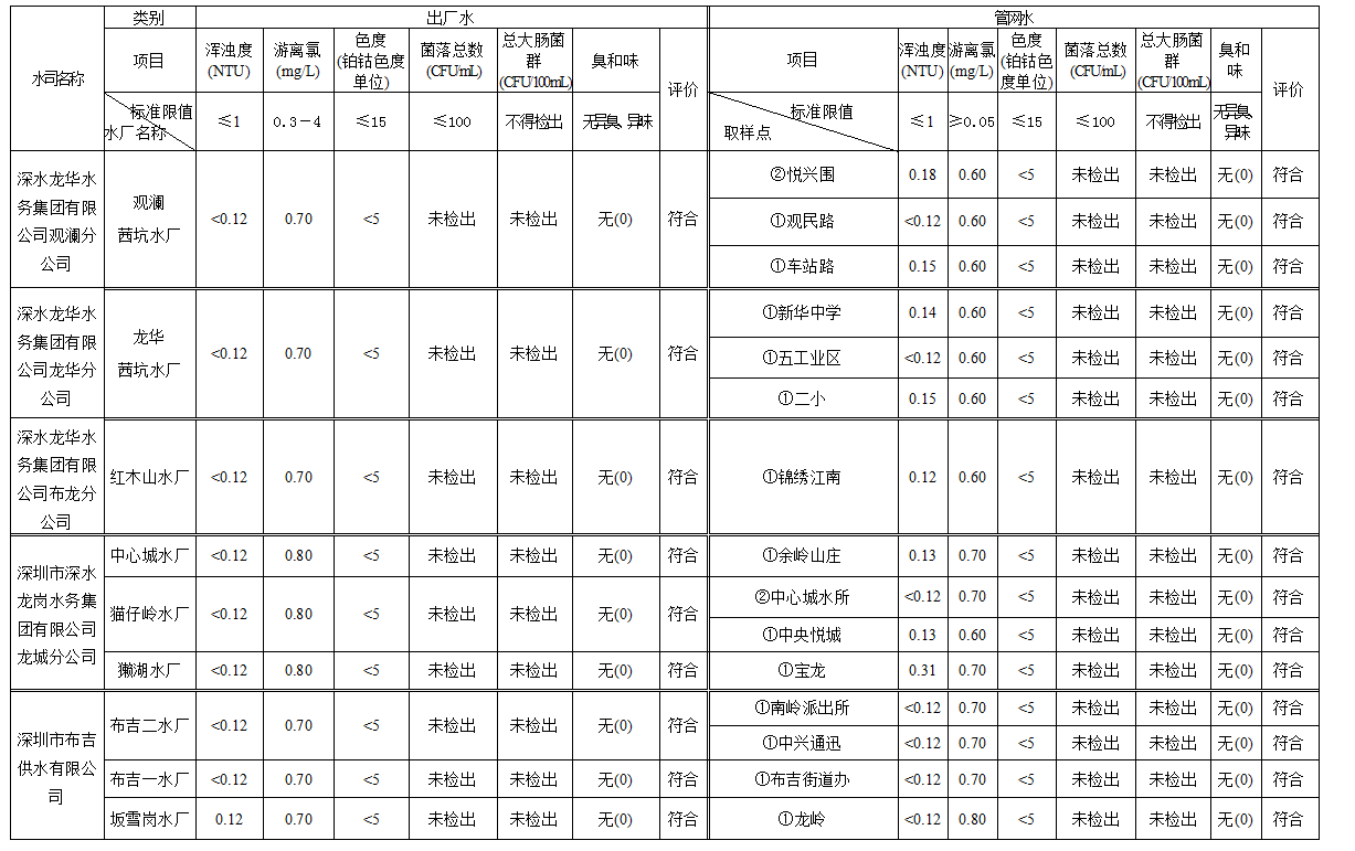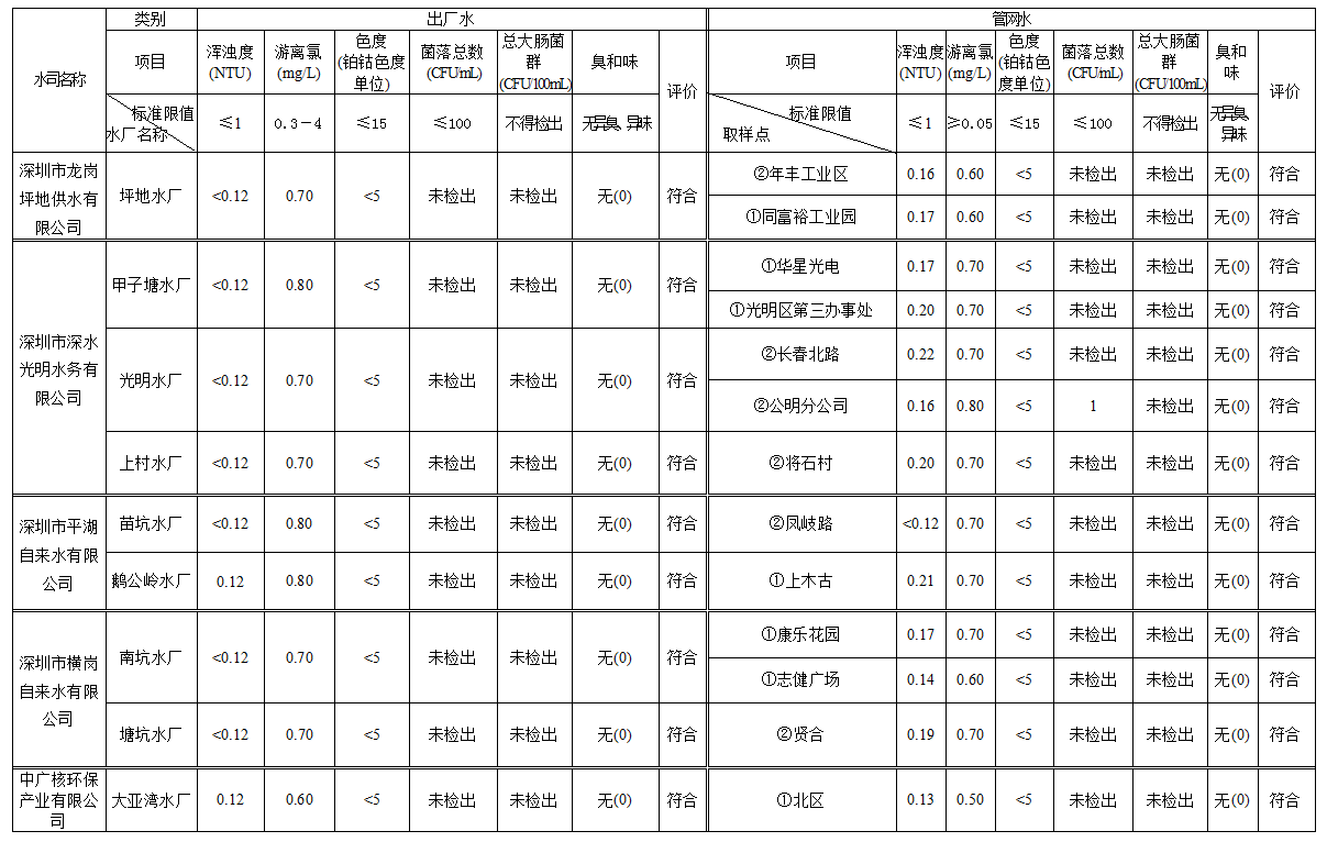 見圳客戶端·深圳新聞網(wǎng)2020年4月4日訊(見圳客戶端、深圳新聞網(wǎng)記者葉梅)2020年2月,深圳市水務(wù)局對(duì)全市42個(gè)水廠出廠水水樣以及68個(gè)管網(wǎng)水水樣進(jìn)行了抽檢。檢測(cè)結(jié)果表明,依據(jù)GB5749—2006《生活飲用水衛(wèi)生標(biāo)準(zhǔn)》,所有受檢42個(gè)出廠水水樣和68個(gè)管網(wǎng)水水樣的渾濁度、消毒劑(游離氯或二氧化氯或總氯)、色度、菌落總數(shù)、總大腸菌群及臭和味共6項(xiàng)常規(guī)指標(biāo)全部符合該標(biāo)準(zhǔn)的規(guī)定,出廠水水樣合格率為100%,管網(wǎng)水合格率為100%。
