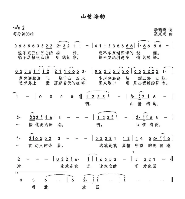 《山情海韻》歌詞大氣,飽含深情。作者以詩一般的語言為我們描繪了一幅幅優(yōu)美多姿的畫面,詮釋了深圳從一個小漁村發(fā)展成繁華大都市的壯闊景象,展現(xiàn)了年輕一代充滿活力、努力奮斗、只爭朝夕的精神面貌,催人奮進。