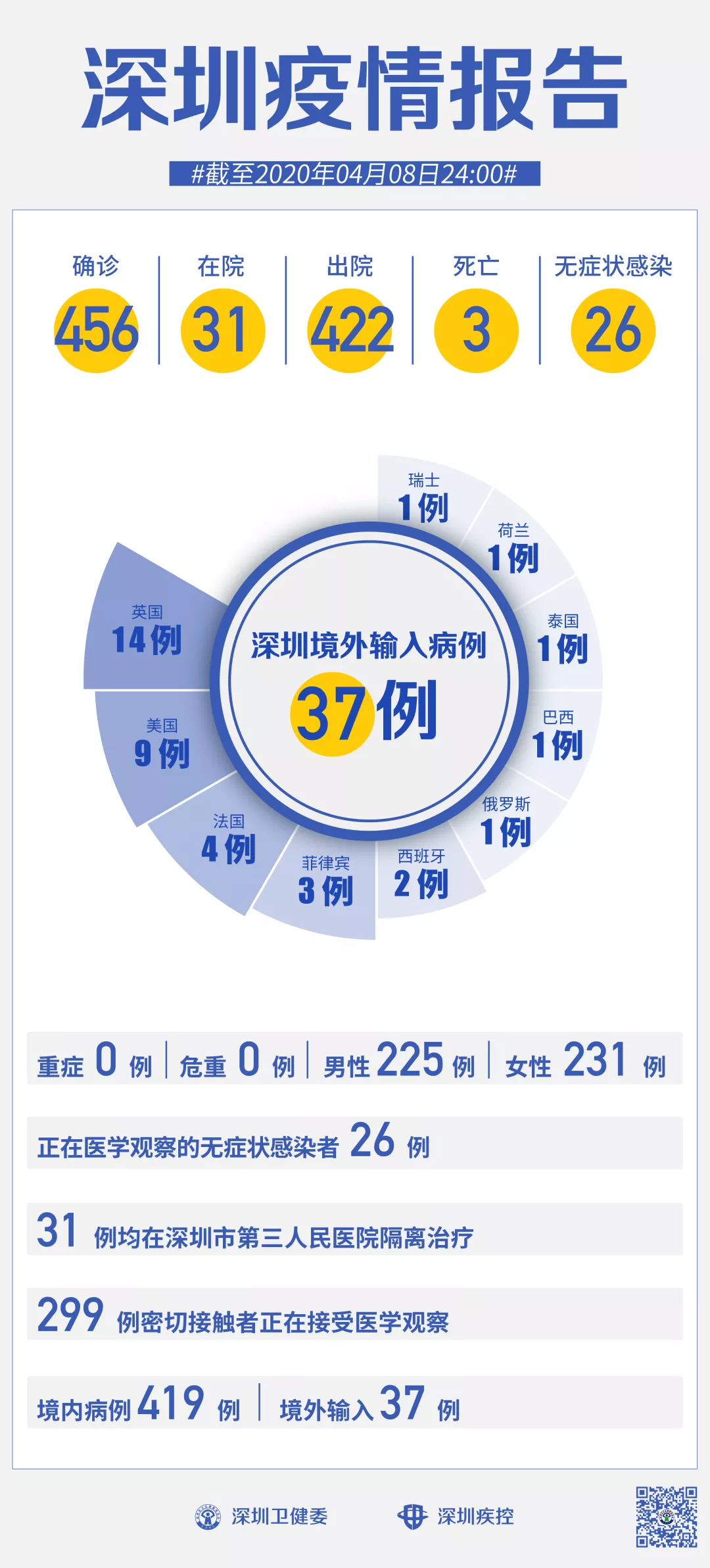 截至4月8日24時,深圳累計報告新冠肺炎病例456例。4月8日當(dāng)天新增無癥狀感染者1例,出院1例。