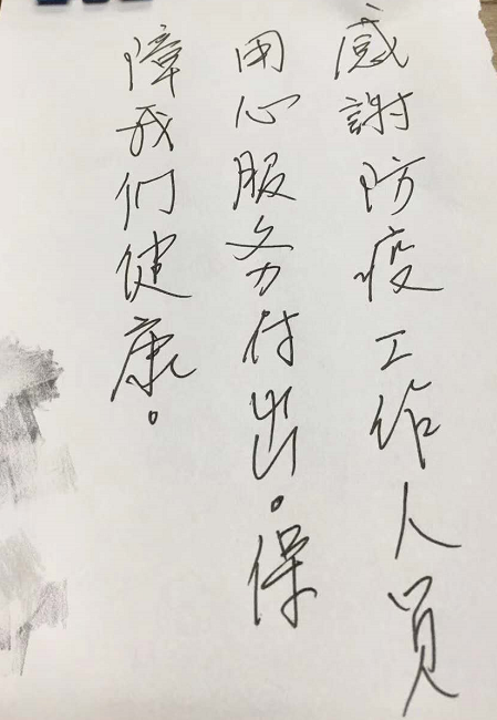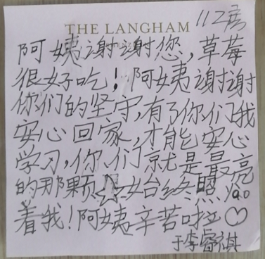 每當(dāng)看到了一批批解除隔離的人開開心心地收拾行李回家,看到客人留下的感謝信、微信留言,尤其是聽到客人們離開時(shí)一句句真摯的話語,同事們都倍感欣慰,更加堅(jiān)信風(fēng)雨過后,終會(huì)見到彩虹。