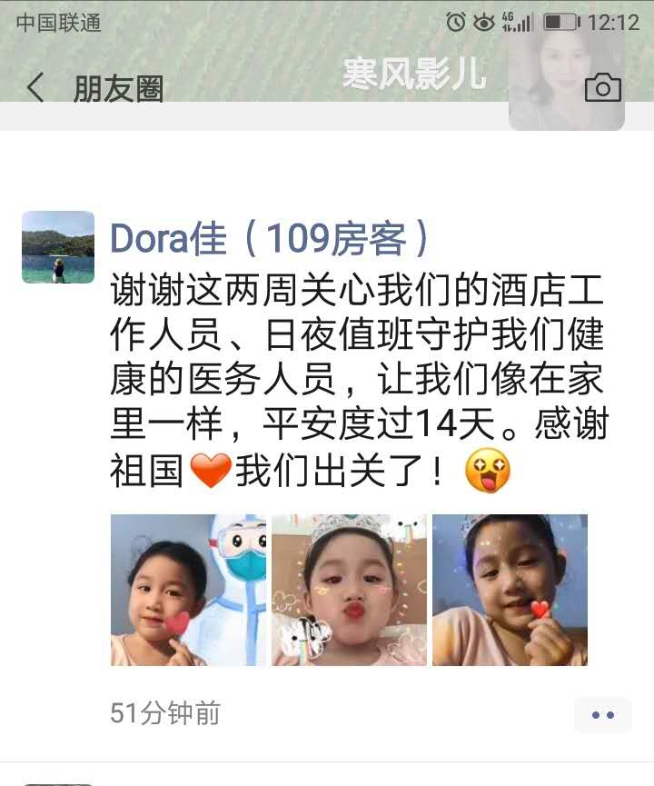四是對(duì)確有特殊要求的隔離人員進(jìn)行個(gè)性化服務(wù)。住213的某先生從文萊回國因家里原因在隔離期間情緒波動(dòng)比較大,要求給他買10盒煙及啤酒,楊梅林了解到這一情況后,第一時(shí)間添加了客人的微信,只要一有空閑就找客人聊天并開導(dǎo)他不要有心理壓力,幾天下來,客人明顯開朗了很多,煙已經(jīng)很少抽了,啤酒一餐只喝一瓶,考慮到安全問題,每餐均被給楊梅林部分“退貨”了。還有401房單獨(dú)住了一位11歲的小女孩,劉群每天有空就給小朋友打電話,噓寒問暖,對(duì)入住酒店的特殊客人或帶小朋友的房間楊梅林和劉群服務(wù)的特別細(xì)致。她們常掛嘴邊的一句話是:隔離人不隔離愛,讓他們感受到家一樣的溫暖。
