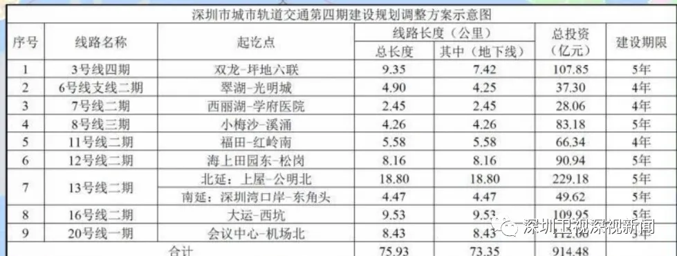 13號線二期,含北延段和南延段。北延段自上屋站至公明北站,線路長度18.8公里,為地下線,采用A型車8輛編組;總投資229.18億元,項(xiàng)目建設(shè)工期5年。南延段自深圳灣口岸站至東角頭站。線路長度4.47公里,為地下線,總投資49.62億元,建設(shè)工期5年。