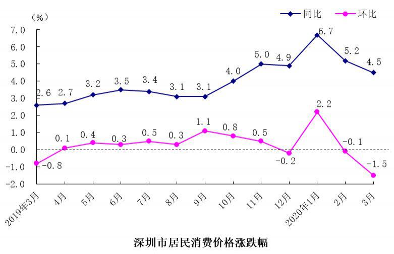 深圳特區(qū)報(bào)2020年4月12日訊 4月12日,國家統(tǒng)計(jì)局深圳調(diào)查隊(duì)發(fā)布最新統(tǒng)計(jì)數(shù)據(jù),3月份,深圳居民消費(fèi)價(jià)格(CPI)環(huán)比下降1.5 %,降幅比上月擴(kuò)大1.4個(gè)百分點(diǎn);CPI同比上漲4.5%,漲幅比上月收窄0.7個(gè)百分點(diǎn)。