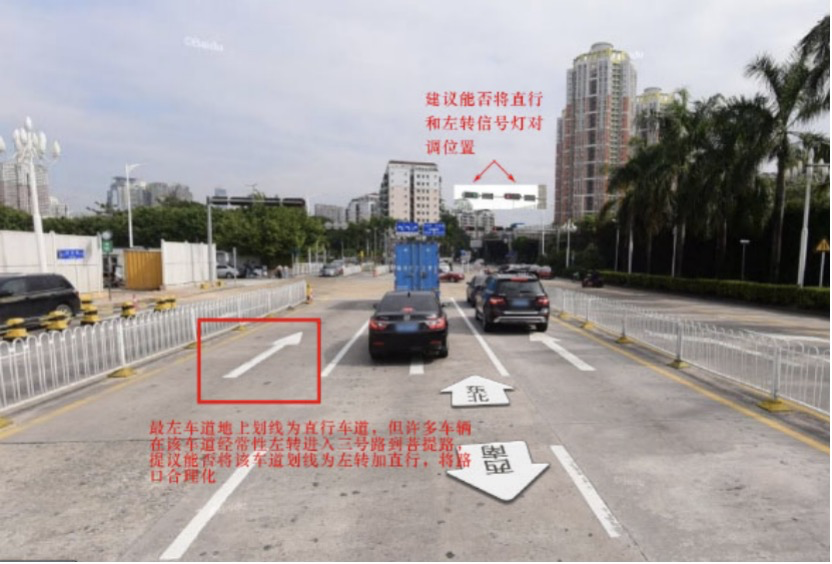 市民建議,桂花路與三號路交叉路口的直行信號燈和左轉(zhuǎn)信號燈對調(diào)位置;同時,桂花路此處的直行最左側(cè)車道可改為左轉(zhuǎn)加直行標(biāo)識。這樣既可以方便社會車輛在此左轉(zhuǎn),又避免有些駕駛員因為沒注意到左轉(zhuǎn)信號燈而隨直行車輛左轉(zhuǎn)造成的堵塞或交通事故。