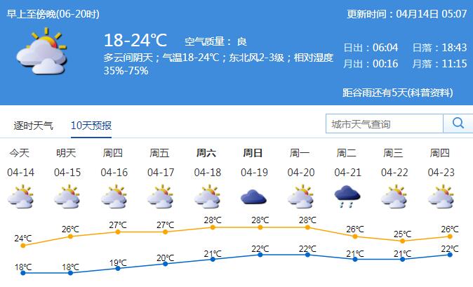 14日我市多云間陰天;氣溫18-24℃;東北風(fēng)2-3級;相對濕度35%-75%,全市森林火險(xiǎn)黃色預(yù)警信號生效中。