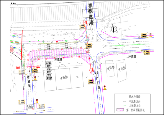 第一階段:對桂花路(福保隧道-香樟道段)南半幅(靠紅樹福苑側)進行封閉占用施工,北半幅臨時調整為三車道,一車道西行(進保稅區(qū)方向),兩車道東行(出保稅區(qū)方向)。行人及非機動車輛可通過現(xiàn)狀公園側人行道或紅樹福苑退線空間通行。自4月20日起,本階段預計持續(xù)施工60天。