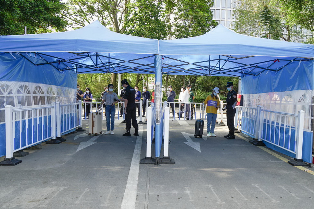 帶行李箱的學(xué)生走專用通道,依次完成掃碼核驗、測量體溫等流程后進入校園。