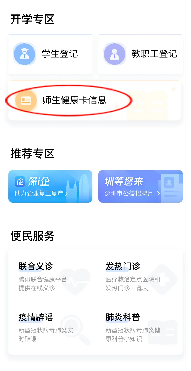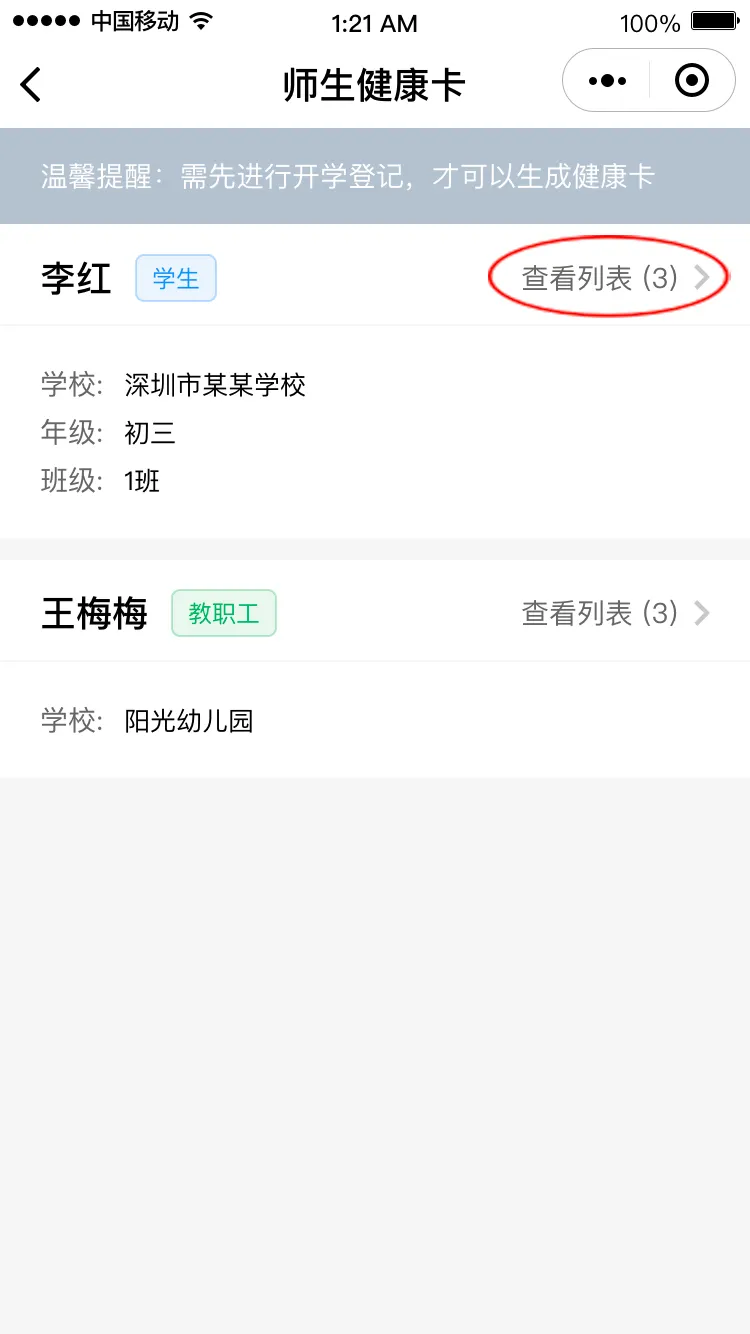 在開學(xué)專區(qū),點擊“師生健康卡信息”,進入師生健康卡人員列表。