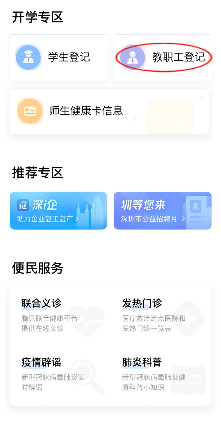 在開(kāi)學(xué)專區(qū),點(diǎn)擊“教職工登記”進(jìn)行自主申報(bào)和實(shí)名認(rèn)證。