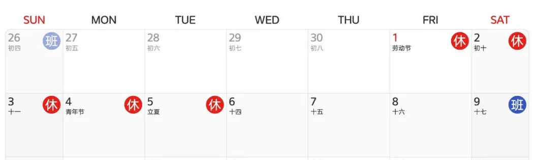“五一”小長假即將到來,4月26日(本周日)5月9日(下下周六)要上班!
