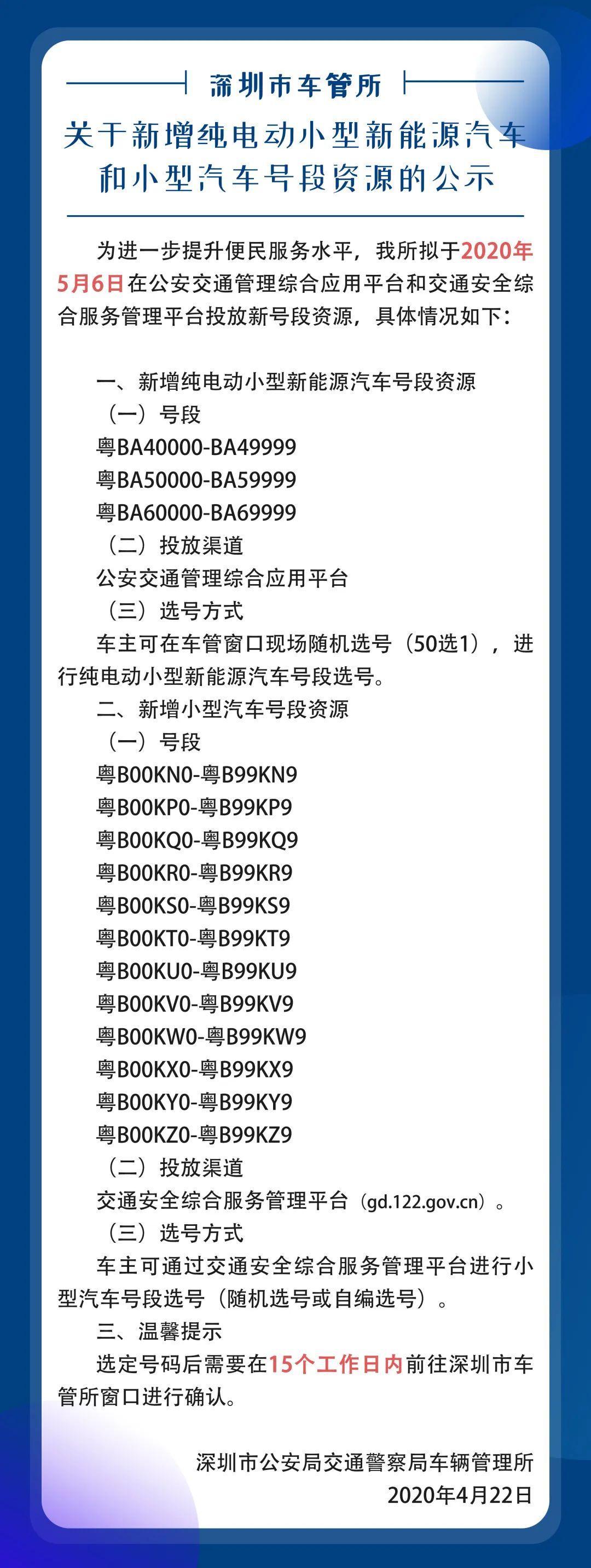 見圳客戶端?深圳新聞網(wǎng)2020年4月23日訊 為進一步提升便民服務(wù)水平,深圳市車管所擬于2020年5月6日在公安交通管理綜合應(yīng)用平臺和交通安全綜合服務(wù)管理平臺投放新號段資源。具體情況如下: