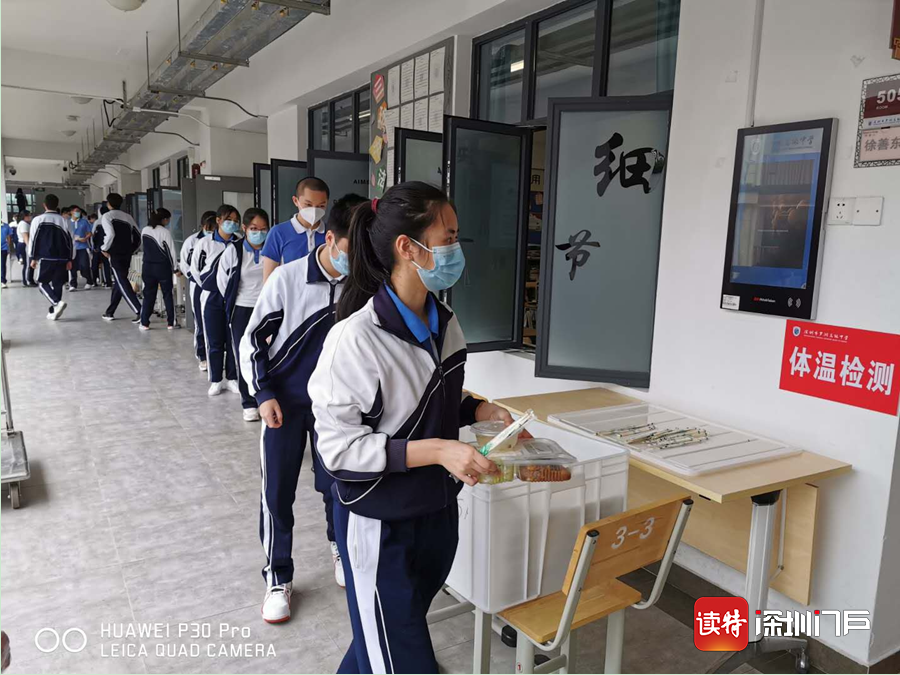 為保障疫情防控期間學(xué)生的用餐安全,羅湖高級(jí)中學(xué)采用“送餐制”,將午餐盒飯送餐到班,學(xué)生在餐前按七步法洗手后,依次在班級(jí)門口領(lǐng)餐后回到座位就餐。