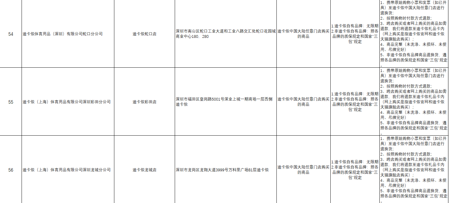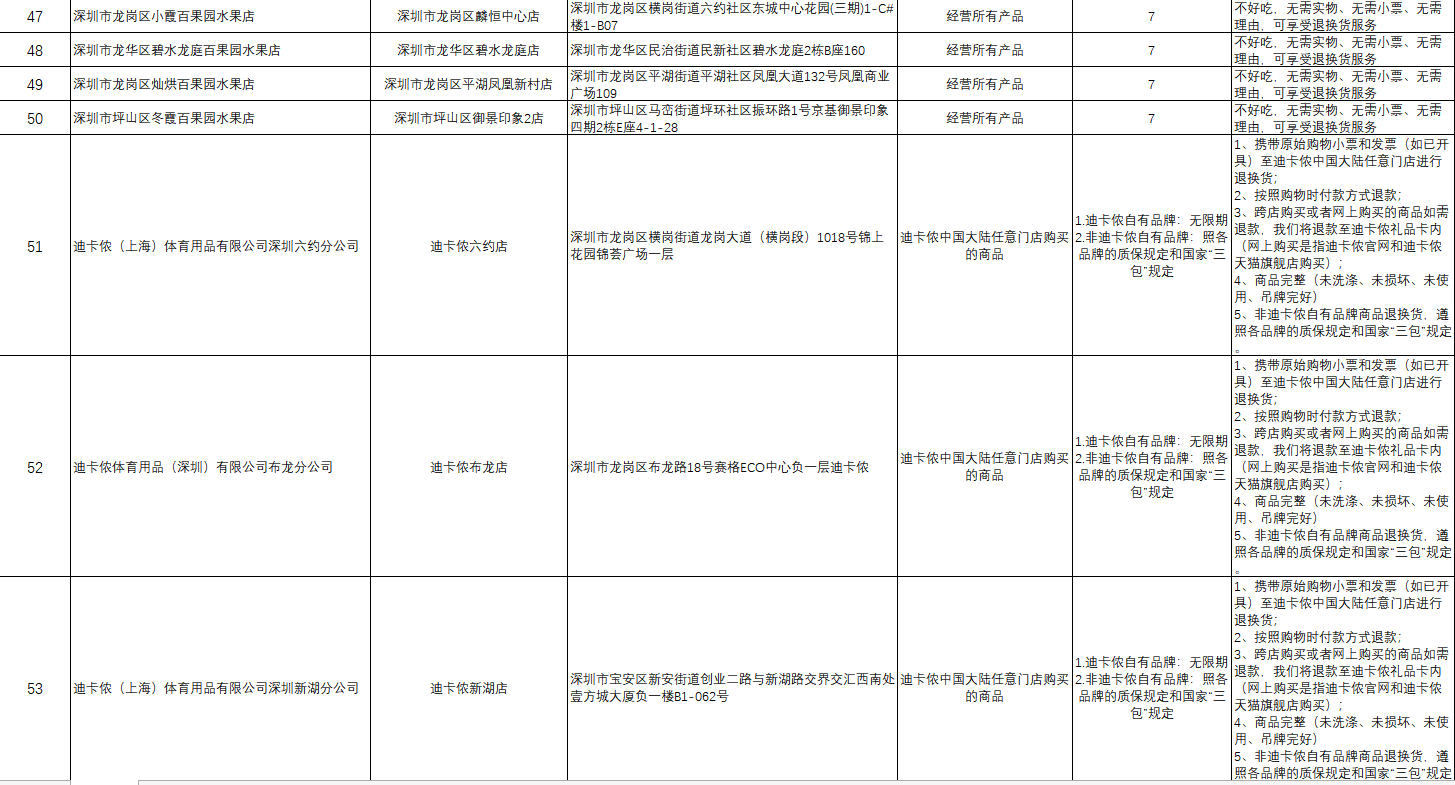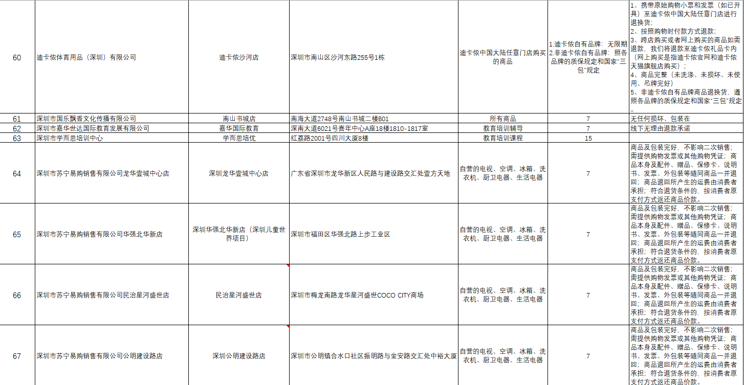“首批參與的部分企業(yè)承諾遠(yuǎn)高于活動(dòng)基本要求,退貨期限不止是7天?!笔邢瘯?huì)相關(guān)負(fù)責(zé)人舉例說,天虹商場(chǎng)聯(lián)營(yíng)服裝鞋帽類和日用商品類承諾的退貨限期為30天,錢大媽和迪卡儂自有品牌承諾無退貨限期。
